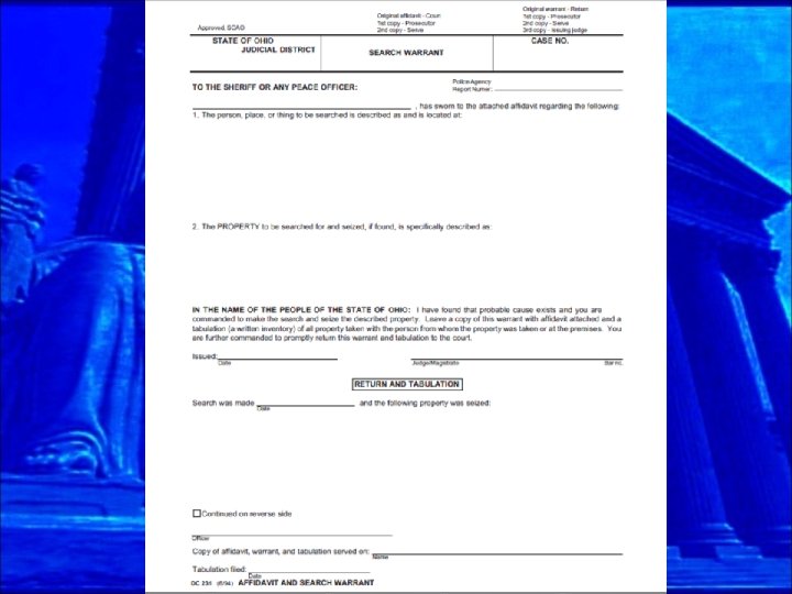 SEARCH WARRANTS CAN BE ISSUED FOR - ORC 2933. 21 ¨ STOLEN PROPERTY ¨ WEAPONS ¨ DRUGS ¨ FORGED OR COUNTERFEIT ITEMS ¨ OBSCENE MATERIALS (MAPP V. OHIO) ¨ GAMBLING DEVICES ¨ ILLEGAL LIQUOR ¨ HAZ/MAT ¨ ETC