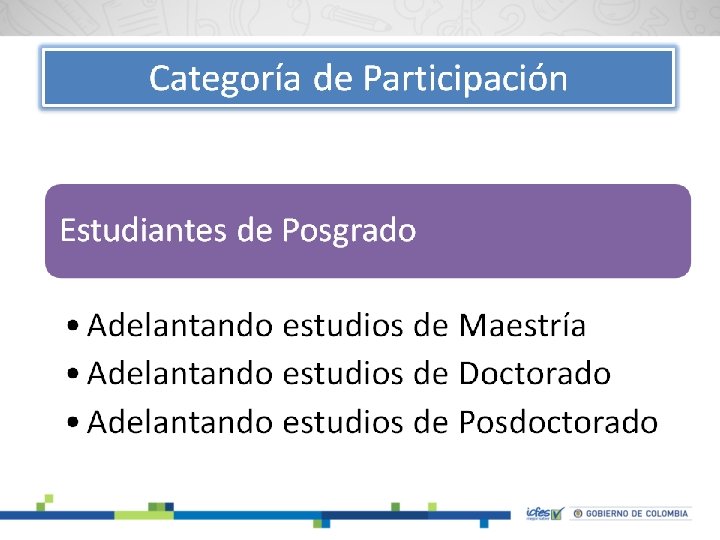 Convocatoria dirigida a Estudiantes de Posgrados Duración de la convocatoria Categorías de participación Financiación Criterios de selección Publicación Ganadores • Del 26 de febrero al 15 de mayo • Estudiantes de Posgrados • Hasta 10 millones de pesos • Estructura general de la propuesta. • Aporte metodológico. • Aporte a la literatura. • Originalidad. • Enfoque regional en la pregunta de investigación. (plus) • 24 de julio