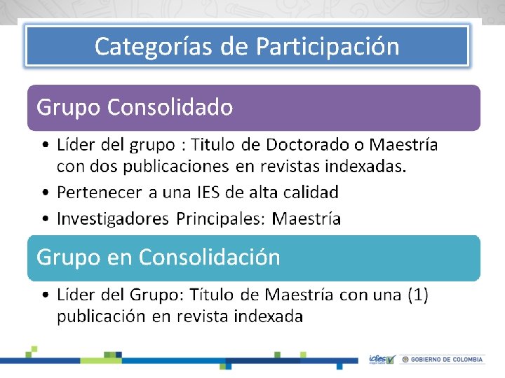 Convocatoria dirigida a Grupos de Investigación Duración de la convocatoria Categorías de participación Financiación Criterios de selección Publicación Ganadores • Del 26 de febrero al 15 de mayo • Grupos consolidados • Grupos en consolidación • Hasta 50 millones de pesos • Estructura general de la propuesta. • Aporte metodológico. • Aporte a la literatura. • Originalidad. • Enfoque regional en la pregunta de investigación. (plus) • 24 de julio