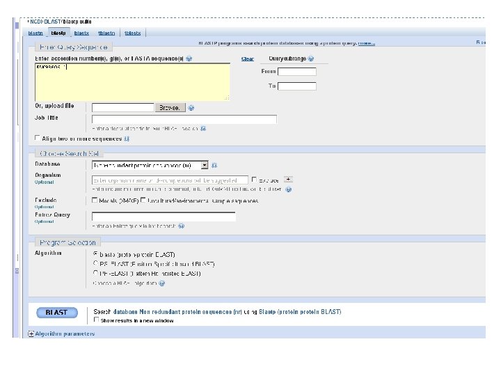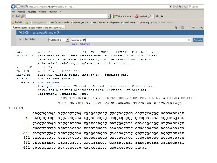 RICERCHE BIOINFORMATICHE ü SEQUENZA NUCLEOTIDICA Gene. Bank http: //www. ncbi. nlm. nih. gov/sites/entrez Ensembl http: //www. ensembl. org/index. html ü SEQUENZA PROTEICA E INFORMAZIONI SULLA PROTEINA Swissprot website http: //www. ebi. ac. uk/swissprot/ Ex. PASy Proteomics Server http: //www. expasy. org/proteomics Uniprot http: //www. uniprot. org/ ü INFORMAZIONI SU SNPs (is a free public archive for genetic variation within and across different species) db. SNPs http: //www. ncbi. nlm. nih. gov/projects/SNP/ ü RICERCHE DI OMOLOGIE E DOMINI CONSERVATI BLAST http: //www. ncbi. nlm. nih. gov/blast/Blast. cgi? CMD=Web&PAGE_TYPE=Blast. Home Pfam http: //pfam. sanger. ac. uk/ SMART http: //smart. embl-heidelberg. de/