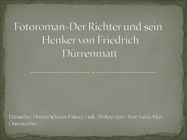 Darsteller: Patrick Fink als Tschanz Max Österreicher als Gastmann Philipp Apin als Lutz, 2. Diener und Doktor Hungertobel Tom Vater als Diener und von Schwendi Florian Scherer als Kommissar Bärlach Gestaltung: Patrick Fink