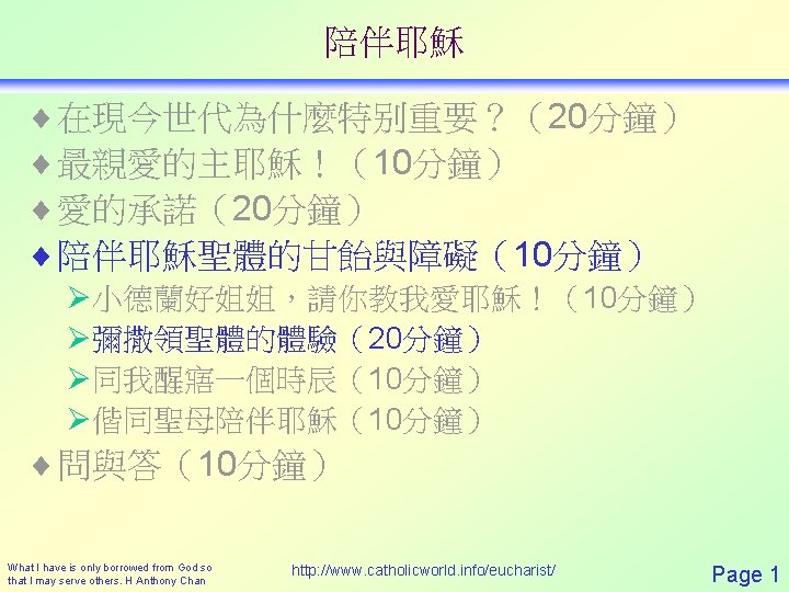 願耶穌至聖之體, 常受讚美稱謝 Oh Sacrament Most Holy Oh Sacrament Divine All praise and all thanksgiving be every moment Thine. 請您每星期或每月認簽一小時,偕同聖母來陪伴耶穌聖體。 What I have is only borrowed from God so that I may serve others. H Anthony Chan Page 7 Please sign up for an hourhttp: //www. catholicworld. info/eucharist/ per week or per month to accompany Jesus.