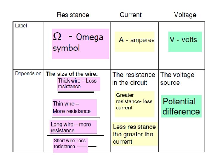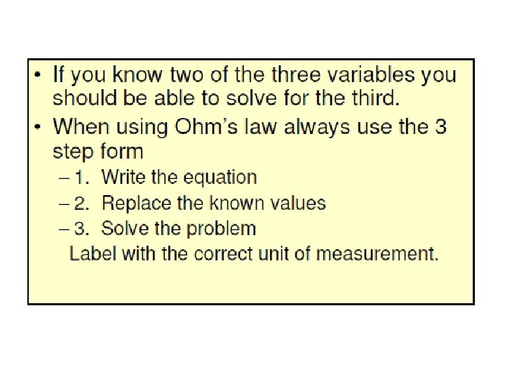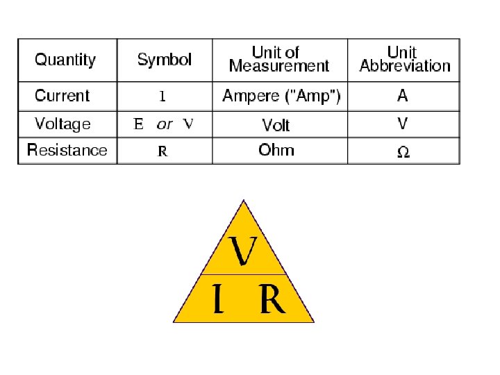 Voltage measured in volts, symbolized by the letters "E" or "V". Current measured in amps, symbolized by the letter "I". Resistance measured in ohms, symbolized by the letter "R".