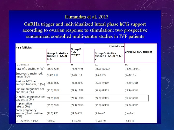 FAILURES? OHSS prevention by Gn. RH agonist triggering of final oocyte maturation in a Gn. RH antagonist protocol in combination with freeze-all strategy: a prospective multicenter study • Conclusions: “…a single case of a severe early onset OHSS occurred” – E 2 trigger day=47, 877 pmol/L – 13 oocytes – The patient was hospitalized on day of OPU, with abdominal distension, drastically enlarged ovaries (right and left ovarian volume 363 cm 2 and 261 cm 2, respectively), and lower abdominal pain. • She received low molecular weight heparin, cabergoline (0. 5 mg/d), and IV infusion therapy, including albumin. Griesinger G, et al. Fertil Steril 2011; 95: 2029– 2033