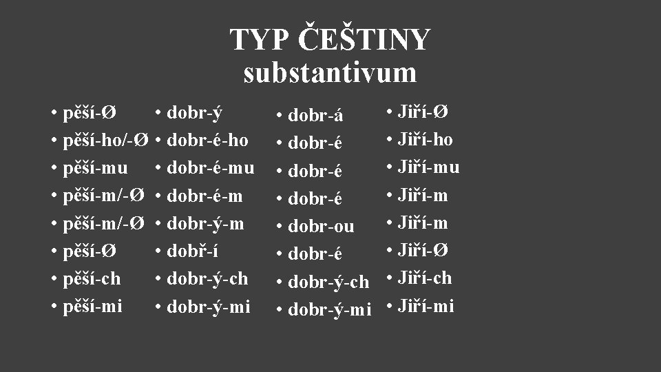 TYP ČEŠTINY adjektivum • žena • pán • chud-ý • pán-a • chud-é-ho • ženy • pánu/-ovi • chud-é-mu • ženě • pán-a • chud-é-ho • ženu • ženo • pan-e • chud-ý • pánu/-ovi • chud-é-m • ženě • chud-ý-m • ženou • pánem • o chudých • o ženách • o pánech • matčin-a • matčin-u • matčin-a matčin-o matčin-y matčin-a matči-ně matčin-u matčin-o matčina matčino • matčině • matčin-ým matčin-ou matčin-ým • o matčiných