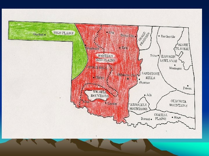 Western Oklahoma • Western Red Plains: This is a plain of red soil that is between the north and south boundaries of western OK. Agriculture is a major industry. Has the biggest population. • High Plains: Made up of the panhandle and far NW OK. It is the highest, driest, and flattest region. The cattle industry is important in the High Plains.
