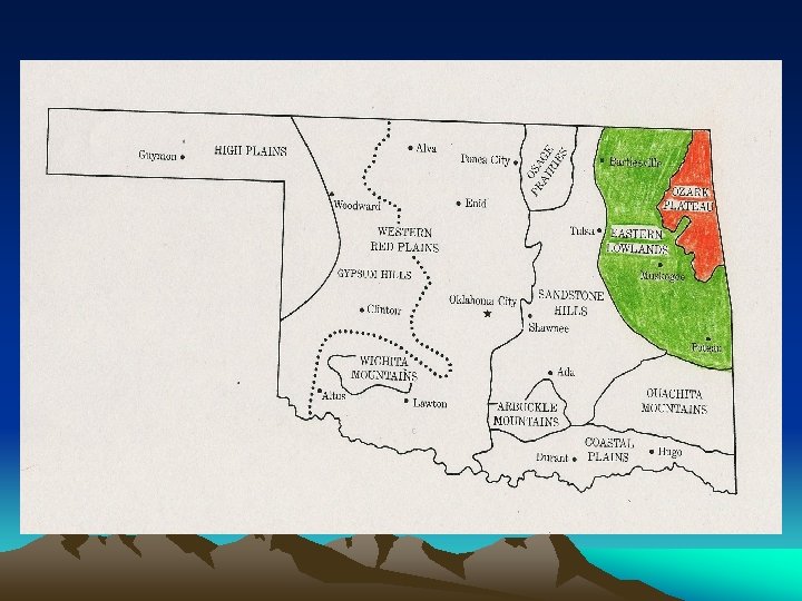 Western Oklahoma • The Arbuckles: Located in South Central OK. Famous for swift, clear streams and waterfalls. Contains many types of building stones. • The Wichitas: Located in SW OK near Lawton. Mt. Scott is the highest peak, 2, 464 feet.