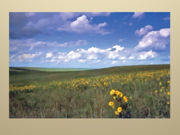 Tallgrass Prairie • Soils are dark and deep • Climate is warm and somewhat wet • Preserve---excessive plowing and grazing destroys grasses (Dust Bowl)