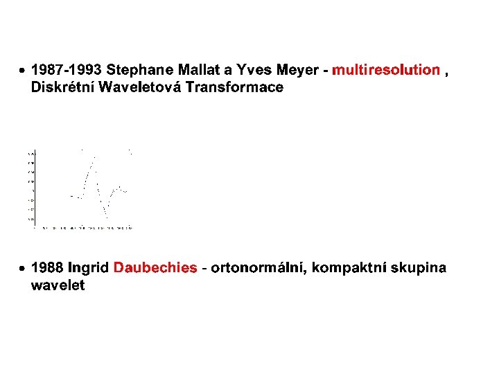 Historie Wavelet · 1909 Alfred Haar - Haar báze. · 1946 Gabor - ne-orthogonální neomezené wavelety · 1976 Croisier, Esteban a Galand - filter banks pro dekompozici a rekonstrukci signálu · 1982 Jean Morlet použil Gabor wavelety k modelování seismických signálů