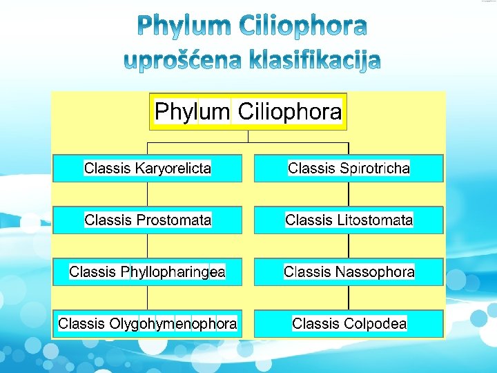• • • Stentor sp. Telo je u obliku trubice Spadaju među najkrupnije protiste, oko 2 mm. Žive u slatkim vodama. Na zvonastom delu nalazi se venac izduženih cilja. Hrane se filtraciono. Imaju jednu veliku kontraktilnu vakuolu, jedan makro- i jedan mikronukleus. • Mogu biti svih boja, plavi, zeleni, … • Razmnožavaju se binarnom deobom. • Velika moć regeneracije. Simbioza sa algama
