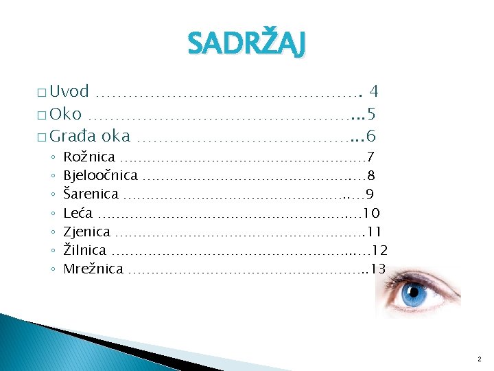 UVOD �U ovoj ćemo prezentaciji naučiti nešto o samom oku, njegovoj građi i manama. � Nadam se da će vam se prezentacija svidjeti 4