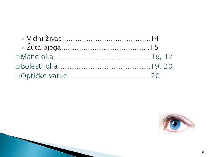 BOLESTI OKA � SLABOVIDNOST § Nepotpun gubitak vida. § Slabovidne osobe moraju nositi leče s jakom dioptrijom. � SLJEPOČA § Potpuni gubitak vida § Do sljepoće može doći zbog oštećenja samog oka ili pak središta za vid u mozgu. § Slijepe osobe služe bijeli štap i brailleovo pismo Slika 4. Braillovo bismo 18
