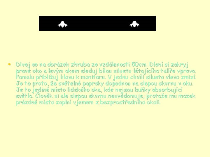 § Dívej se na obrázek zhruba ze vzdálenosti 50 cm. Dlaní si zakryj pravé oko a levým okem sleduj bílou siluetu létajícího talíře vpravo. Pomalu přibližuj hlavu k monitoru. V jednu chvíli silueta vlevo zmizí. Je to proto, že světelné paprsky dopadnou na slepou skvrnu v oku. Je to jediné místo lidského oka, kde nejsou buňky absorbující světlo. Člověk si ale slepou skvrnu neuvědomuje, protože mu mozek prázdné místo zaplní vjemem z bezprostředního okolí.