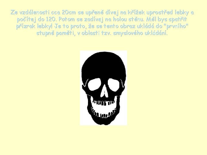 Ze vzdálenosti cca 20 cm se upřeně dívej na křížek uprostřed lebky a počítej do 120. Potom se zadívej na holou stěnu. Měl bys spatřit přízrak lebky! Je to proto, že se tento obraz ukládá do "prvního" stupně paměti, v oblasti tzv. smyslového ukládání.