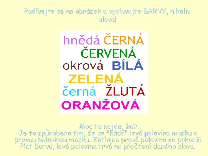 Podívejte se na obrázek a vyslovujte BARVY, nikoliv slova! Moc to nejde, že? Je to způsobeno tím, že se "hádá" levá polovina mozku s pravou polovinou mozku. Zatímco pravá polovina se pokouší říct barvu, levá polovina trvá na přečtení daného slova.