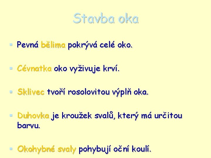 Stavba oka § Pevná bělima pokrývá celé oko. § Cévnatka oko vyživuje krví. § Sklivec tvoří rosolovitou výplň oka. § Duhovka je kroužek svalů, který má určitou barvu. § Okohybné svaly pohybují oční koulí.