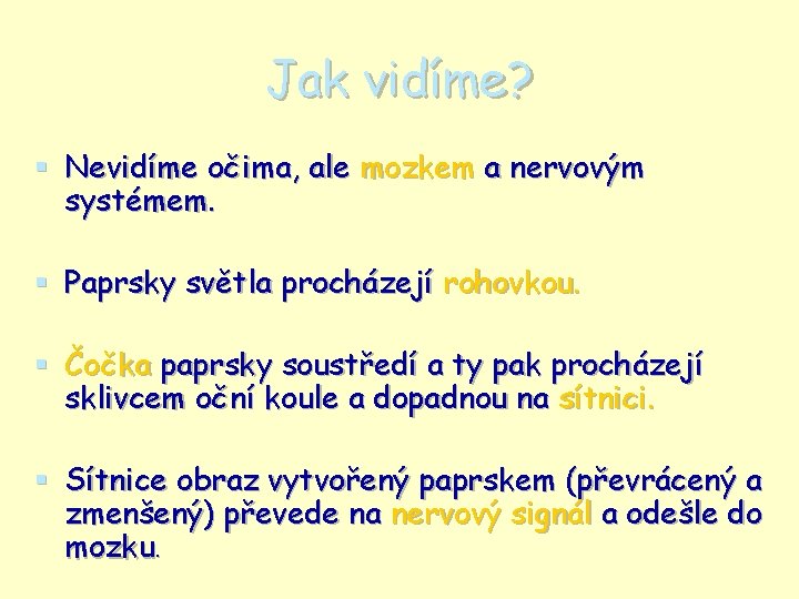 Jak vidíme? § Nevidíme očima, ale mozkem a nervovým systémem. § Paprsky světla procházejí rohovkou. § Čočka paprsky soustředí a ty pak procházejí sklivcem oční koule a dopadnou na sítnici. § Sítnice obraz vytvořený paprskem (převrácený a zmenšený) převede na nervový signál a odešle do mozku.