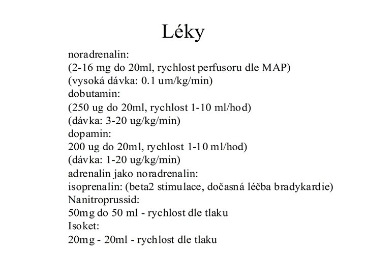 terapeutické schema resuscitace hemodynamiky III - přetrvávající hypotenzi koriguj vasopresory dostatečný MAP – 50 … 60… 70 -75…více mm. Hg ? ? ? alfa 1 mimetika – noradrenalin, dopamin tíže šoku dle dávek NA <0. 1 mcg/kg/min – 0. 3… 0. 6…> 1. 0 mcg/kg/min <30 mcg/min ---- > 60 mcg/min Na 5 mg/50 ml…. 1 ml/hod = 1. 6 mcg/min agonisti V receptorů – vasopresin, terlipresin blokace NO – inhibitory (i)NOS – LMME – CAVE!