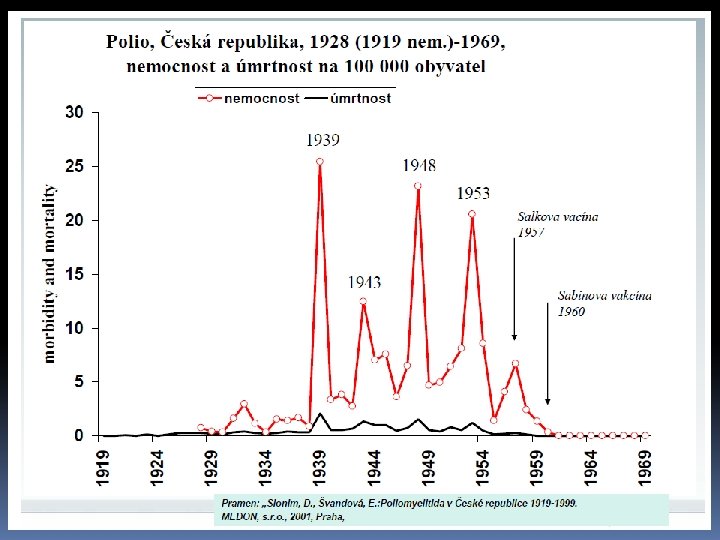 Dětská obrna - ČR Smrtnost Rok Počet onemocnění Počet úmrtí 1939 1943 1945 1948 1953 1956 1957 1958 1959 1809 906 594 2063 1895 388 639 231 146 98 80 139 111 20 27 11 3 (v %) 8, 1 10, 8 13, 5 6, 7 5, 9 5, 2 4, 8 2, 3 1. - 7. 1960 33 1 3 8. 1960 – dosud 0 0 0