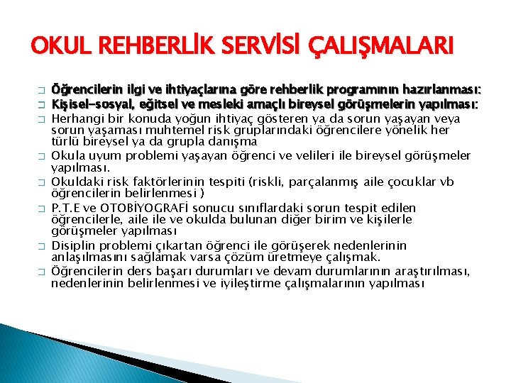 OKUL REHBERLİK SERVİSİ ÇALIŞMALARI � Öğrencilere yönelik testlerin uygulanması: � Problem Tarama Envanteri � Başarısızlık Nedenleri Envanteri � Sınav Kaygısı Envanteri � Kimdir Bu Envanteri � Otobiyografi Envanteri � Sosyometri-Arzu Listeleri-Cümle Tamamlama -Snellen Göz tarama çalışmaları