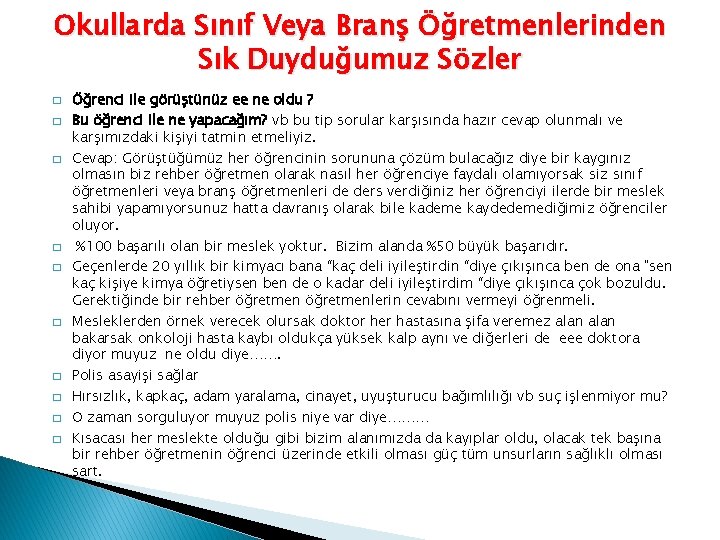 Okullarda Sınıf Veya Branş Öğretmenlerinden Sık Duyduğumuz Sözler � � � � � Öğrenci ile görüştünüz ee ne oldu ? Bu öğrenci ile ne yapacağım? vb bu tip sorular karşısında hazır cevap olunmalı ve karşımızdaki kişiyi tatmin etmeliyiz. Cevap: Görüştüğümüz her öğrencinin sorununa çözüm bulacağız diye bir kaygınız olmasın biz rehber öğretmen olarak nasıl her öğrenciye faydalı olamıyorsak siz sınıf öğretmenleri veya branş öğretmenleri de ders verdiğiniz her öğrenciyi ilerde bir meslek sahibi yapamıyorsunuz hatta davranış olarak bile kademe kaydedemediğimiz öğrenciler oluyor. %100 başarılı olan bir meslek yoktur. Bizim alanda %50 büyük başarıdır. Geçenlerde 20 yıllık bir kimyacı bana “kaç deli iyileştirdin “diye çıkışınca ben de ona "sen kaç kişiye kimya öğretiysen ben de o kadar deli iyileştirdim “diye çıkışınca çok bozuldu. Gerektiğinde bir rehber öğretmenlerin cevabını vermeyi öğrenmeli. Mesleklerden örnek verecek olursak doktor her hastasına şifa veremez alan bakarsak onkoloji hasta kaybı oldukça yüksek kalp aynı ve diğerleri de eee doktora diyor muyuz ne oldu diye……. Polis asayişi sağlar Hırsızlık, kapkaç, adam yaralama, cinayet, uyuşturucu bağımlılığı vb suç işlenmiyor mu? O zaman sorguluyor muyuz polis niye var diye……… Kısacası her meslekte olduğu gibi bizim alanımızda da kayıplar oldu, olacak tek başına bir rehber öğretmenin öğrenci üzerinde etkili olması güç tüm unsurların sağlıklı olması şart.