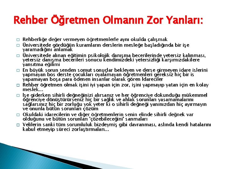 Rehber Öğretmen Olmanın Zor Yanları: � � � � Rehberliğe değer vermeyen öğretmenlerle aynı okulda çalışmak Üniversitede gördüğün kuramların derslerin mesleğe başladığında bir işe yaramadığını anlamak Üniversitede alınan eğitimin psikolojik danışma becerilerinde yetersiz kalınması, yetersiz danışma becerileri sonucu kendimizdeki yetersizliği karşımızdakilere yansıtma eğilimi En büyük sorun senden somut sonuçlar bekleyen ve derse girmeyen idare islerini yapmayan bos derste çocukları oyalamayan öğretmenleri gereksiz hiç bir is yapamayan boşa para ödenen insanlar olarak gören İdareciler Rehber öğretmen olmak işini iyi yapan için zor, işini yapmayıp yatan için en kolay meslek. . . İşe giderken sihirli değneğinizi alırsanız ve her öğrenciye dokunduğu mükemmel öğrenciye dönüştürürseniz hiç bir sağlık ve ahlak sorunları yasamamalarını sağlarsınız hiç bir zorluğu yok yeter ki o sihirli değneği yanınızdan hiç ayırmayın ve onunla bütün sorunları çözüm Okuldaki idarecilerin ve diğer öğretmenlerin senin elinde sihirli değnek var olduğunu ve bütün sorunları 'çözebileceğini' sanmaları Velilerin sanki tüm sorumluluk bizdeymiş gibi davranması, aslında kendi hatalarını kabul etmeyip süreci zorlaştırmaları. . .