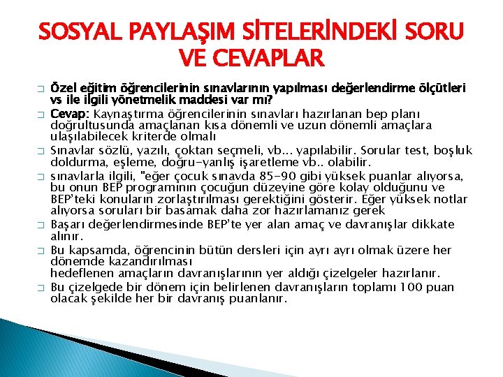 SOSYAL PAYLAŞIM SİTELERİNDEKİ SORU VE CEVAPLAR � � � � Özel eğitim öğrencilerinin sınavlarının yapılması değerlendirme ölçütleri vs ile ilgili yönetmelik maddesi var mı? Cevap: Kaynaştırma öğrencilerinin sınavları hazırlanan bep planı doğrultusunda amaçlanan kısa dönemli ve uzun dönemli amaçlara ulaşılabilecek kriterde olmalı Sınavlar sözlü, yazılı, çoktan seçmeli, vb. . . yapılabilir. Sorular test, boşluk doldurma, eşleme, doğru-yanlış işaretleme vb. . olabilir. sınavlarla ilgili, "eğer çocuk sınavda 85 -90 gibi yüksek puanlar alıyorsa, bu onun BEP programının çocuğun düzeyine göre kolay olduğunu ve BEP’teki konuların zorlaştırılması gerektiğini gösterir. Eğer yüksek notlar alıyorsa soruları bir basamak daha zor hazırlamanız gerek Başarı değerlendirmesinde BEP’te yer alan amaç ve davranışlar dikkate alınır. Bu kapsamda, öğrencinin bütün dersleri için ayrı olmak üzere her dönemde kazandırılması hedeflenen amaçların davranışlarının yer aldığı çizelgeler hazırlanır. Bu çizelgede bir dönem için belirlenen davranışların toplamı 100 puan olacak şekilde her bir davranış puanlanır.