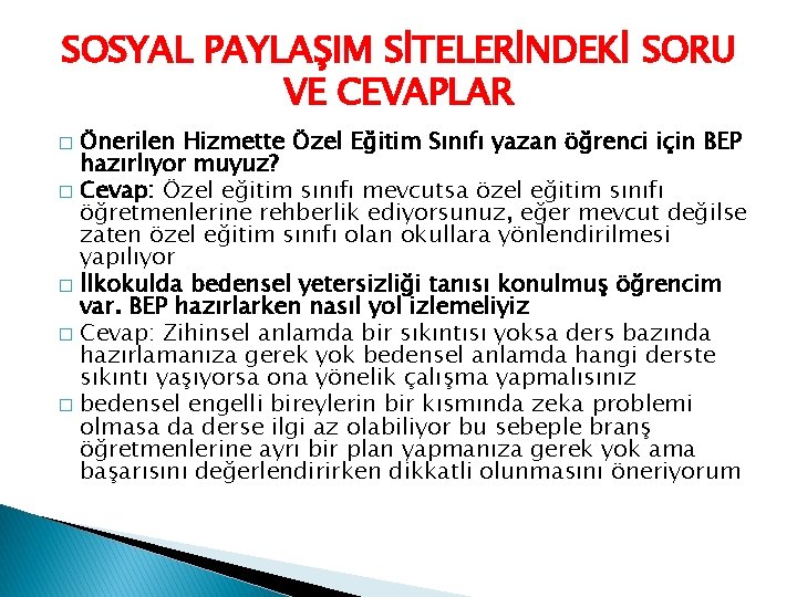 SOSYAL PAYLAŞIM SİTELERİNDEKİ SORU VE CEVAPLAR Önerilen Hizmette Özel Eğitim Sınıfı yazan öğrenci için BEP hazırlıyor muyuz? � Cevap: Özel eğitim sınıfı mevcutsa özel eğitim sınıfı öğretmenlerine rehberlik ediyorsunuz, eğer mevcut değilse zaten özel eğitim sınıfı olan okullara yönlendirilmesi yapılıyor � İlkokulda bedensel yetersizliği tanısı konulmuş öğrencim var. BEP hazırlarken nasıl yol izlemeliyiz � Cevap: Zihinsel anlamda bir sıkıntısı yoksa ders bazında hazırlamanıza gerek yok bedensel anlamda hangi derste sıkıntı yaşıyorsa ona yönelik çalışma yapmalısınız � bedensel engelli bireylerin bir kısmında zeka problemi olmasa da derse ilgi az olabiliyor bu sebeple branş öğretmenlerine ayrı bir plan yapmanıza gerek yok ama başarısını değerlendirirken dikkatli olunmasını öneriyorum �
