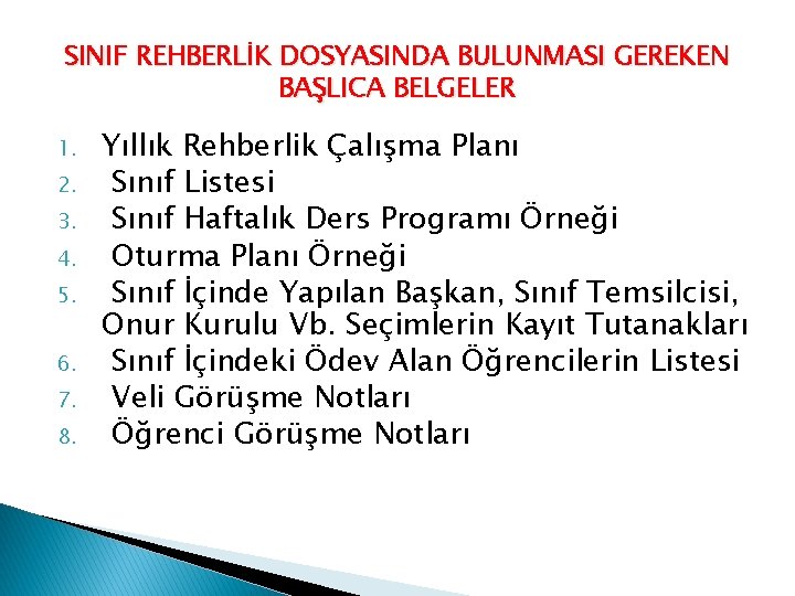 SINIF REHBERLİK DOSYASINDA BULUNMASI GEREKEN BAŞLICA BELGELER 9. 10. 11. 12. 13. 14. Öğrencilerin Okul Ve Sınıf İçindeki Gözlem Notları Yardıma Muhtaç Öğrencilerin İsimleri Ve Yapılan Yardımlar Eğitici Kulüplere Öğrenci Dağılım Listesi Gerçekleştirilen Etkinlik Örnekleri (Değerlendirmeleri Yazılmış Olarak) (Lise) Rehberlik Etkinliklerinin Aylık Değerlendirme Formları (Lise) Yıllık Rehberlik Çalışma Planından Yararlanarak Yarıyıl Ve Sene Sonu Rehberlik Faaliyet Raporları