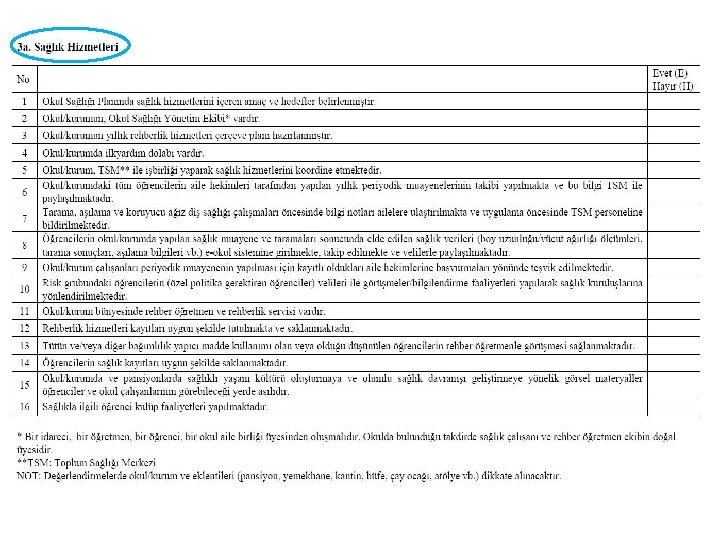 Okul Yönetiminin Hazırlığı - 1 Dosya içeriği Değerlendirme öncesi dosya hazırlanır. Dosyanın eksik olması veya hazır olmaması durumunda değerlendirme başlatılmaz. Ø Okul Sağlığı Yönetim Ekibi üye listesi (Ek 2 a) Ø Okul Sağlığı Planı (Ek 2 b) Ø Öğrenci muayene, aşı ve tarama sonuçlarının sayısal verileri Ø Rehberlik hizmetleri planı, raporları/kayıtları, sayısal verileri Ø Sağlıkla ilgili konularda öğrenci, okul çalışanları ve velilere yönelik olarak yapılan eğitimlere ait dokümanlar ve kayıt/katılım formları Ø Program kapsamında gerçekleştirilen etkinliklere ait belgeler (fotoğraf, kayıt/katılım formları, afiş ve broşür gibi)
