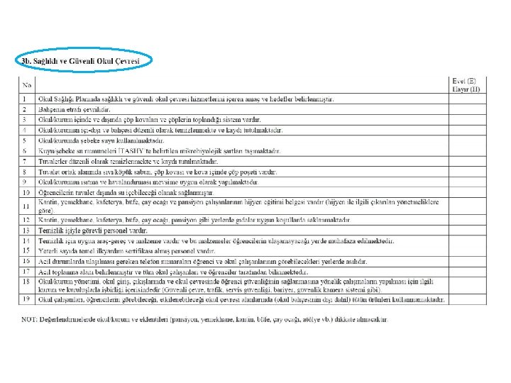 Değerlendirilecek Okullar Milli Eğitim Bakanlığı’na bağlı resmi ve özel; • • Okulöncesi (anaokulu) İlkokul Ortaokul ve liseler Pansiyonlu okullar Mesleki eğitim merkezleri Özel eğitim iş uygulama merkezleri Özel mesleki eğitim merkezleri