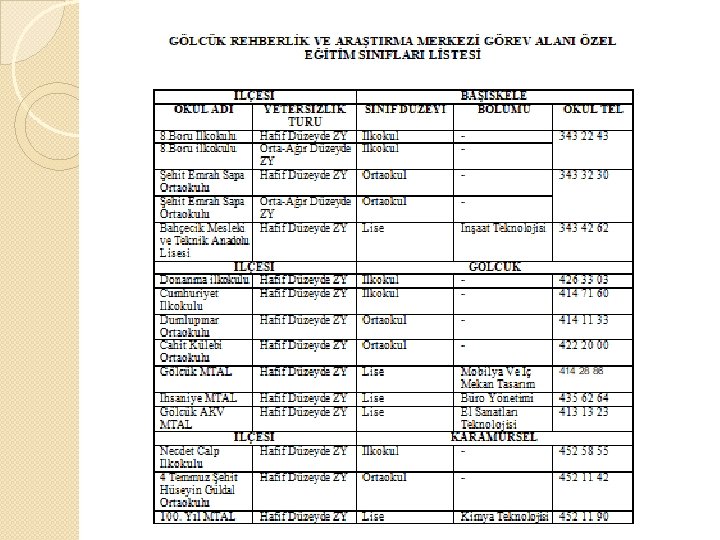İlköğretimde özel eğitim hizmetleri � MADDE 30 – Değişik (1) Özel eğitime ihtiyacı olan bireyler ilkokul ve ortaokul kademesindeki eğitimlerini öncelikle kaynaştırma uygulamaları yoluyla akranları ile bir arada sürdürebilecekleri gibi özel eğitime ihtiyacı olan bireyler için açılan ilkokul ve ortaokullarda da sürdürebilirler. � (2) İlkokul ve ortaokul kademesindeki genel eğitim programlarının amaçlarını gerçekleştiremeyecek durumda olan bireyler ise eğitimlerini, gelişim alanlarındaki performans düzeylerine göre hazırlanmış eğitim programlarının uygulandığı özel eğitim okul ve kurumlarında sürdürürler.