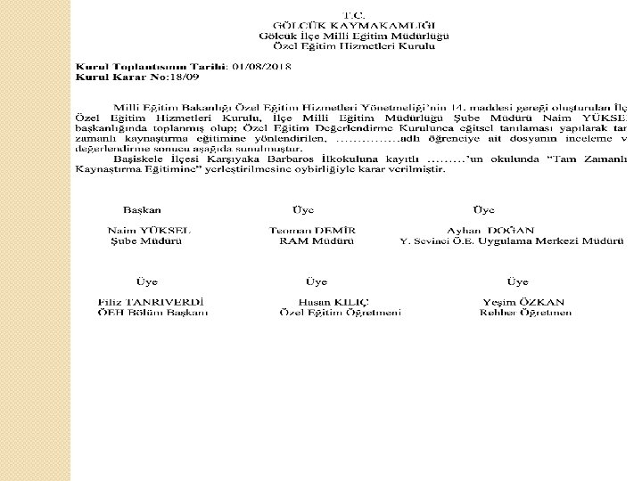 EĞİTSEL TANILAMA İZLEME VE DEĞERLENDİRME EKİBİ RAM MÜDÜR/ MÜDÜR YRD RAM ÖZEL EĞİTİM BÖLÜM BAŞKANI PSİKOLOJİK DANIŞMAN ÖZEL EĞİTİM ÖĞRETMENLERİ AİLE UZMANLAR