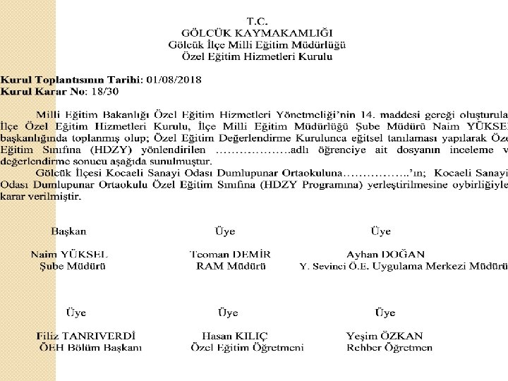 İL MEM MDR YRD ŞUBE MÜDÜRÜ RAM ÖZEL EĞİTİM BÖLÜM BAŞKANI ÖZEL EĞİTİM ÖĞRETMENİ PSİKOLOJİK DANIŞMAN ÖZEL EĞİTİM OKULU/ KAYNAŞTIRMA OKULU MÜDÜRÜ