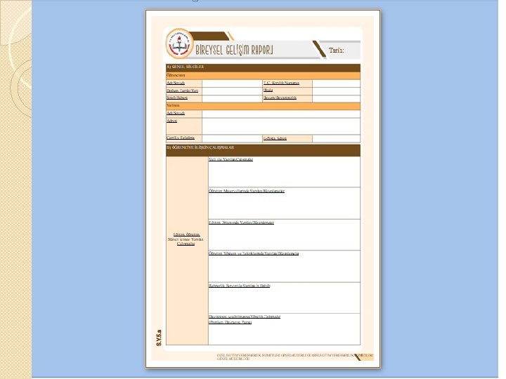 BİREYSEL GELİŞİM RAPORU NASIL DOLDURULUR? Bireysel gelişim raporunda öğrencinin tedbiri ve sınıfı özellikle belirtilerek eksiksiz doldurulmalıdır. Bireysel Gelişim Raporu 3 gruptan oluşur 1 - BEP’e alınan amaçlar 2 - Kazandırılan kazanımlar 3 - kazandırılamayan önümüzdeki dönem için önerilen kazanımlar Bakanlık Eğitsel Değerlendirme İsteği Formunda ve Bireysel Gelişim Raporunda neden sayı ve üst yazı istiyor? Yazının hangi okula ait olduğunu görebilmek için Özel eğitim hizmetleri yönetmeliğinin inceleme için gerekli evraklar kısmında bunu zorunluluk olarak gösterdiği için Kişi yada kurumlarca istismar edilmemesi için Yazışma kuralları gereğince