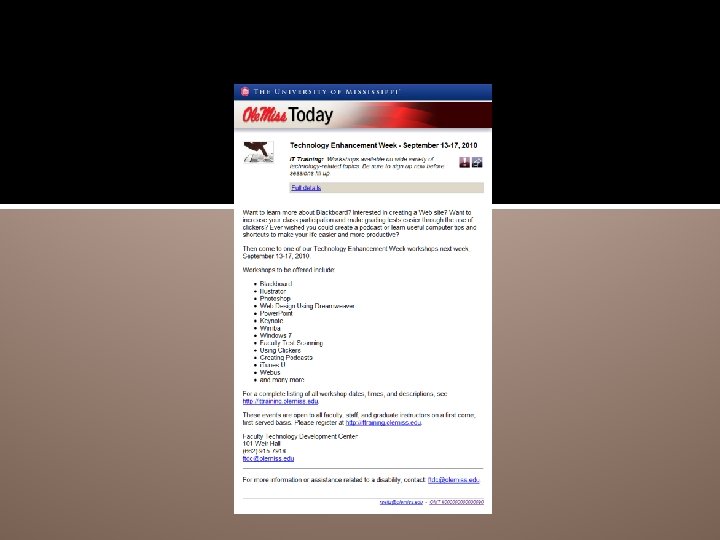 Ole Miss Today � Message formatting � HTML formatted piece � Attachments (pdf, ics) � Scheduled delivery � Adjustable message lifetime � Most announcements delivered in single message � Messages available in my. Ole. Miss � Message acknowledgement, if necessary