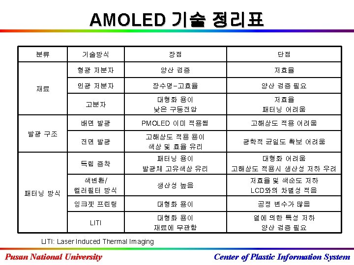 Structure Comparison between OLED and LCD AMOLED A-Si TFT /LTPS TFT B/L a-Si TFT / LTPS TFT OLED C/F LC 5 -6 층수 >10 <2 mm 두께 6 mm 3 g 무게 10 g 35 m. W 소비전력 150 m. W <0. 1 m. S 응답속도 >25 m. S -25~65 동작온도 0~50 Pusan National University Center of Plastic Information System