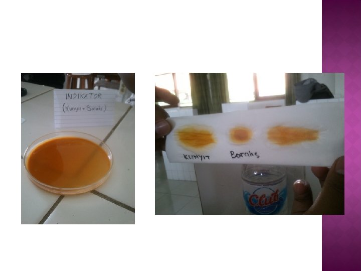 � Prosedur kerja � Kunyit dikupas, lalu dihaluskan dengan cara diparut kemudian ditambahkan sedikit air. Selanjutnya kunyit tersebut dibungkus dengan kain putih, lalu diperas untuk memperoleh air kunyit. � Membuat larutan boraks dengan cara memasukkan sedikit boraks ke dalam beberapa sendok teh air. ( sesuai dengan kebutuhan ) � Mencampurkan lima tetes larutan kunyit dengan lima tetes larutan boraks. mengaduk kedua larutan itu hingga rata dan bewarna merah kecoklatan. Larutan merah kecoklatan itu dapat dijadikan indikator adanya kandungan boraks dalam bahan makanan. � Menumbuk contoh makanan yang akan diuji hingga halus, dan letakkan dalam cawan petri. Usahakan masing-masing bahan makanan tidak saling tercampur satu sama lain. � Meneteskan air kunyit ke atas contoh makanan yang telah dihaluskan tadi dengan menggunakan pipet. Amati dan catat perubahan warna yang terjadi. Catatan : Bahan makanan yang berubah menjadi merah kecoklatan setelah ditetesi air kunit diduga mengandung boraks.