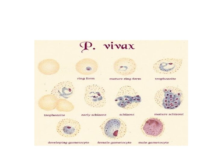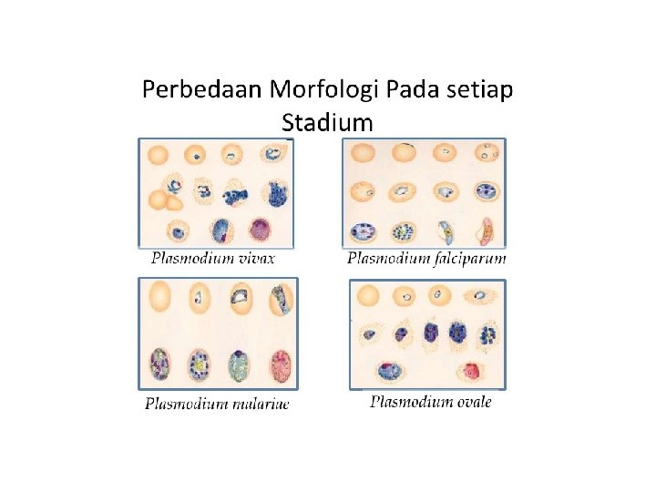Plasmodium vivax • Eritrosit membesar, Eritrosit membesar 2. Terdapat titik schuffner disekitar parasit 3. Titik Schuffner bentuknya halus dan tersebar merata di sekitar parasit 4. Stadium yang ditemukan : trofozoit, skizon dan gametosit (semua stadium)