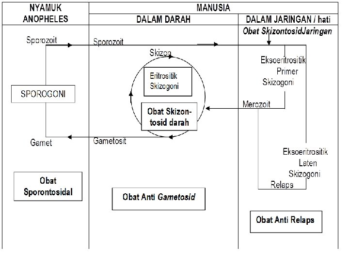 perkembangan • Terdapat lima jenis parasit plasmodium. Kasus yang paling banyak ditemukan di Indonesia disebabkan oleh Plasmodium falciparum dan Plasmodium vivax. Kedua jenis parasit ini adalah penyebab malaria yang paling umum. Plasmodium falciparum bertanggung jawab atas sebagian besar kematian yang diakibatkan oleh malaria. Plasmodium vivax bisa mengakibatkan penderita yang telah sembuh menjadi sakit lagi karena parasit ini dapat diam bersembunyi di dalam organ hati manusia sebelum menjadi aktif lagi. • Tiga parasit yang lainnya adalah Plasmodium ovale, Plasmodium malariae dan Plasmodium knowlesi. Ketiga parasit ini adalah jenis yang jarang ditemui kejadiannya di Indonesia.
