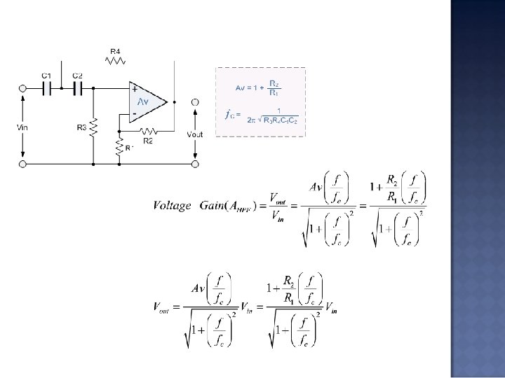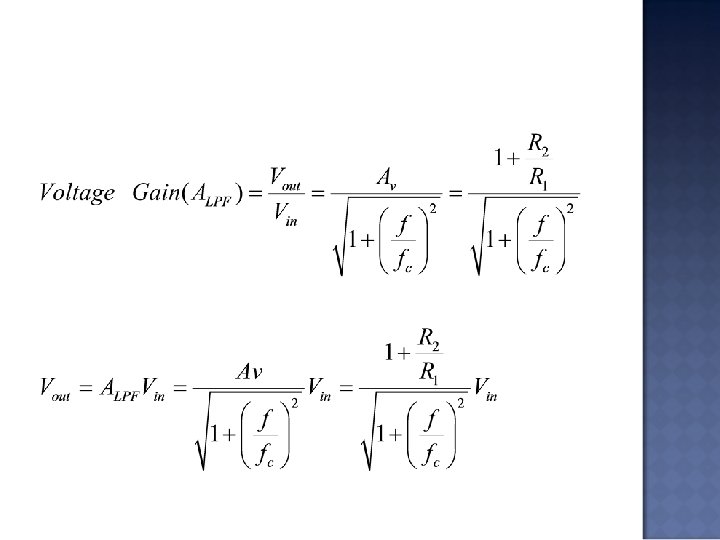1. AKTIF LOW PASS FILTER A. LOW PASS FILTER DENGAN PENGUATAN SATU KALI DC Gain(Av) = 1 Where: AF = Av the pass band gain of the filter ƒ = the frequency of the input signal in Hertz, (Hz) ƒc = the cut-off frequency in Hertz, (Hz)