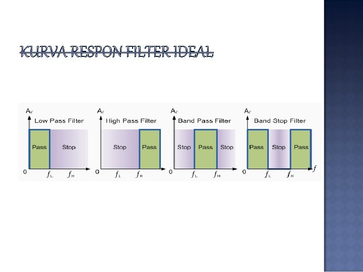 PENGERTIAN DAN FUNGSI FILTER Filter berfungsi memisahkan 1 dari dua yang masuk, dimana hanya 1 frekeunsi yang akan dibuang dan yang lainnya dilewatkan tergantung dari konfigurasi filter yang digunakan. Tujuan utamanya adalah mendapatkan frekuensi yang diinginkan dan membuang frekuensi yang tidak diinginkan