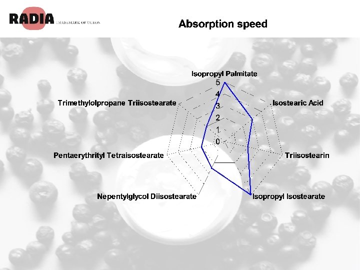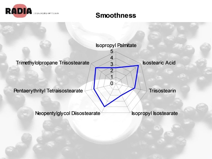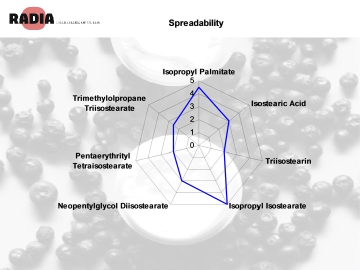 Radia 7750: Isoamyl Laurate Very good solvating power Ability to disperse pigments Excellent skin compatibility Low viscosity & Quick absorbing Excellent sensorial profile Sunscreen products & UV filters Colour cosmetics and skin care. Baby care and cleansing formulations Improved spreadability. Silicone like sensorial profile