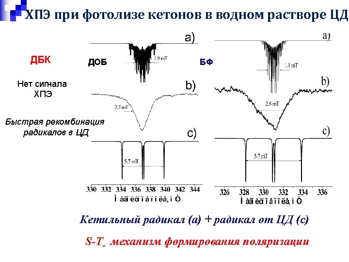 Photolysis of b-CD / deoxybenzoin complex Guest Ketyl radical NMR spectrum Observed TR EPR spectrum Ph. CH 2 COPh (Ph. CH 2)2 CD b-CD radical CIDNP spectrum Magnetic field, m. T Ø α-cleavage and hydrogen abstraction Ølocation of ketyl radical inside CD cavity ØIncreasing of radical pair lifetime ØStrong exchange interaction in radical pair Øformation of rearrangement product