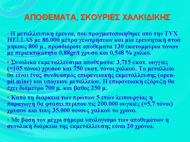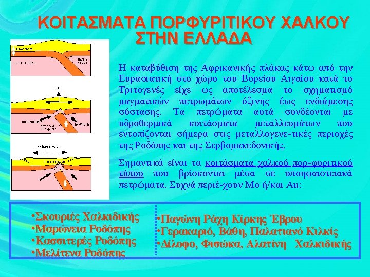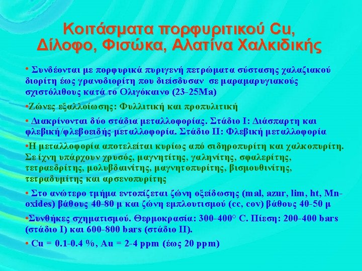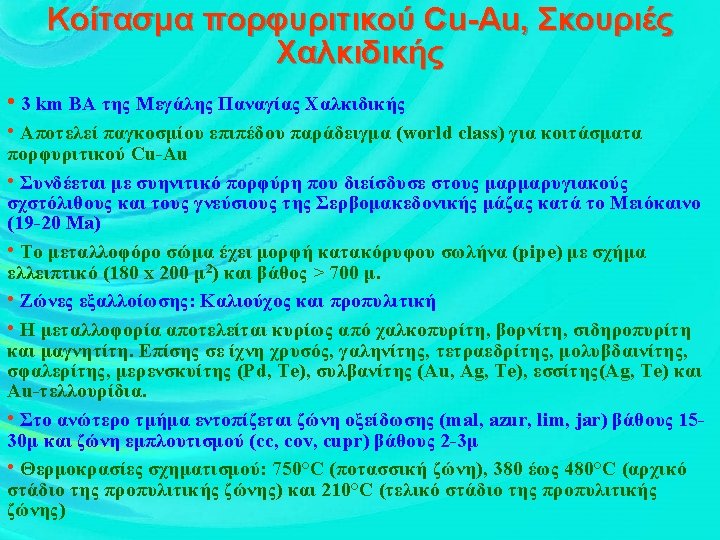 FLUID INCLUSIONS • Four types of fluid inclusions in ore-related quartz • Salinities from 5 to 55 wt% Na. Cl equiv • Homogenisation temperatures varying mainly from 280 to 460 °C. • Estimated trapping pressures of the ore-forming fluids range from 150 to 510 bar • Boiling is considered to be the main process of ore formation SULPHUR ISOTOPIC compositions for the pyrite and molybdenite suggest an igneous derivation of sulphur. Ascending melts and hydrothermal fluids interacted with the sulphide-bearing metavolcanic rocks, incorporating sulphur and ore metals (including Cu, Mo, Pb, Zn and Au) from the lithosphere Maronia deposit has the potential of containing economic quantities of exceptionally high-grade porphyry Cu-Mo ores, with economic gold grades