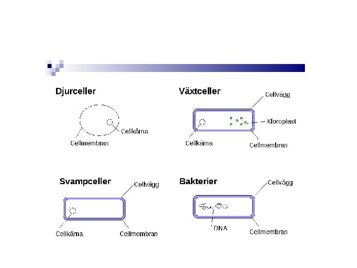 Eukaryota celler – celler med cellkärna Djurceller Cellkärna, cellmembran, mitokondrier, ribosomer, lysosomer Växtceller Cellkärna, cellmembran, mitokondrier, ribosomer, lysosomer kloroplaster, cellvägg (av cellulosa), vakuol Svampceller Cellkärna, cellmembran, mitokondrier, ribosomer, lysosomer cellvägg (av kitin )