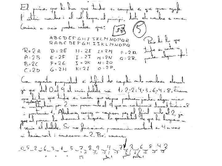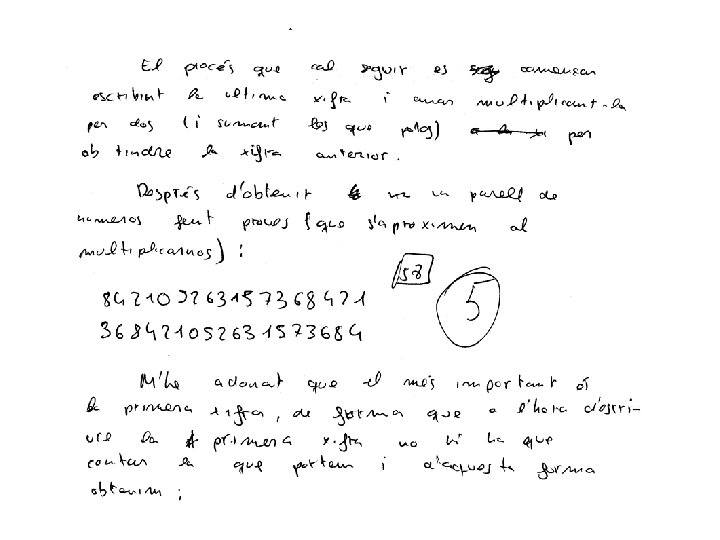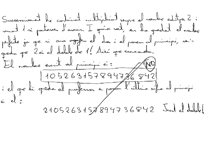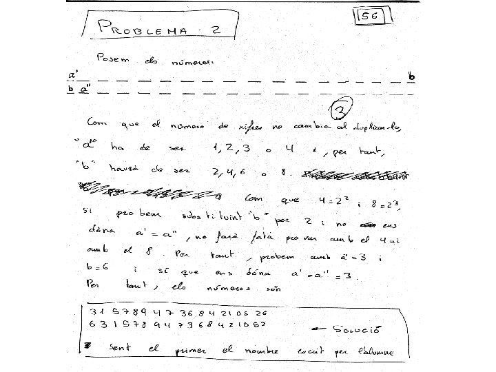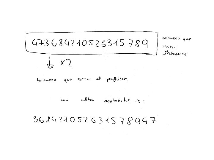 2. - Un grup d’alumnes no té professor, i aprofitant el moment un de tants escriu a la pisarra un número molt llarg, de 18 xifres. Quan arriba el professor de guàrdia, esborra l’última xifra de la dreta i l’escriu al començáment, quedant així un número amb doble valor que el que hi havia inicialment. Quin número havia escrit l’alumne a la pisarra? SOLUCIÓ: Siga I el número inicial i F el final. Tenim A més a més la xifra de les unitats, decenes, centenes, . . . de F és la xifra de les decenes, centenes, unitats de miler, . . . de I. I que F = 2·I. Si suposem que a = 1, tenim I F 3 7 6 3 8 6 4 8 2 1 X 2 4 2