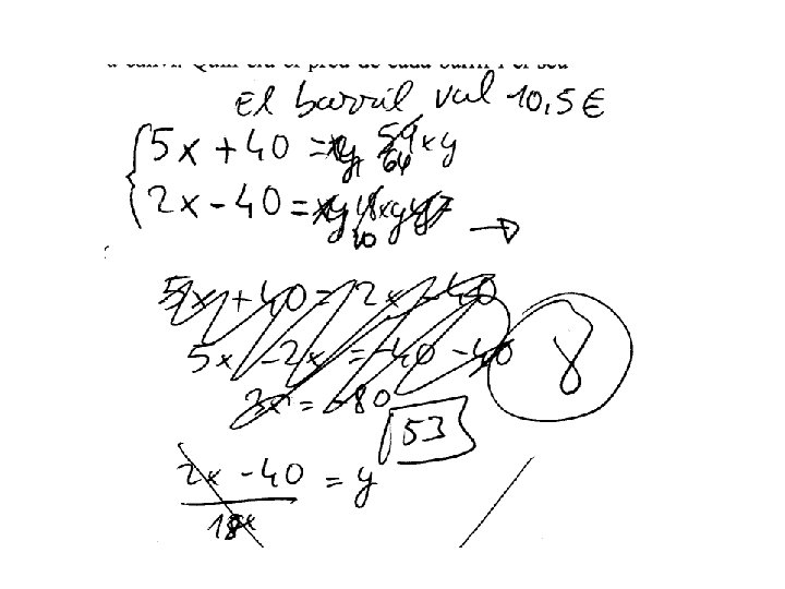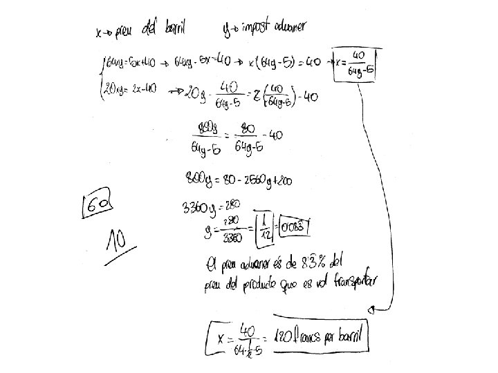 3. - Dos comerciants de vi van entrar en Paris amb 64 i 20 barrils de vi respectivament. Com que no tenien prou per pagar els drets de duana, el primer d’ells va entregar 5 barrils i 40 francs, mentre que el segon va donar 2 barrils, rebent 40 francs com a camvi. Quin era el preu de cada barril i el seu impost duaner? SOLUCIÓ: Un problema d’enunciat: Planteja una situació real i pregunta pel valor de algunes coses. Si x = preu del barril i y = impost duaner, tenim: Aïllant x en la primera i segona equació e igualant Per tant el preu de cada barril es 120 francs i el impost duaner es de 1/12 francs