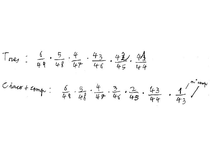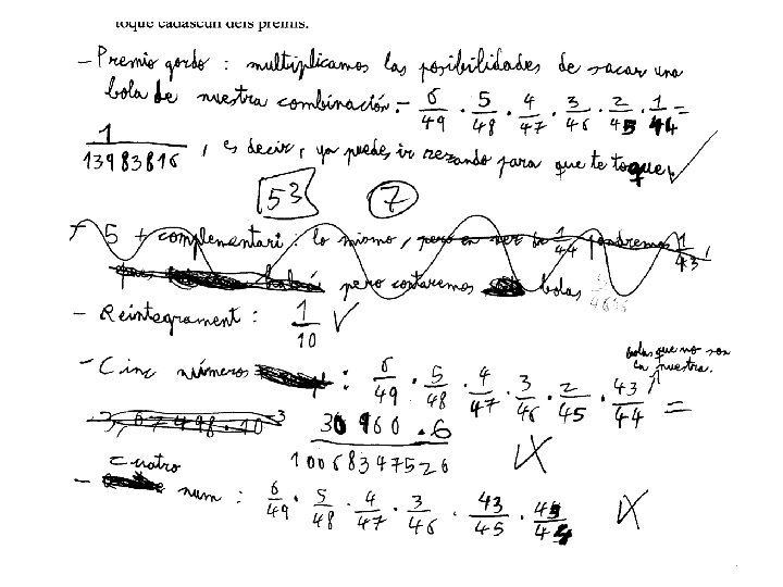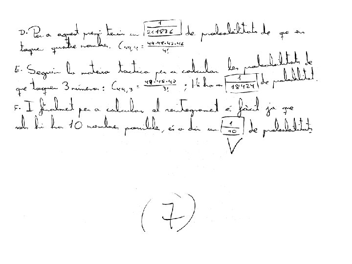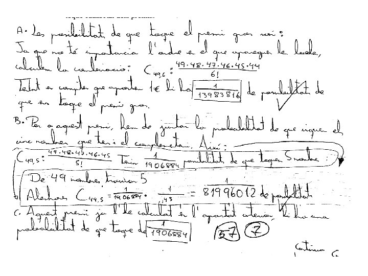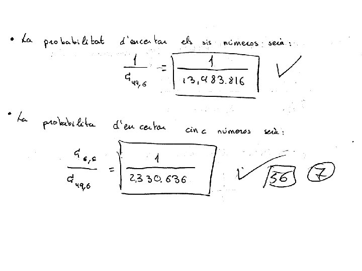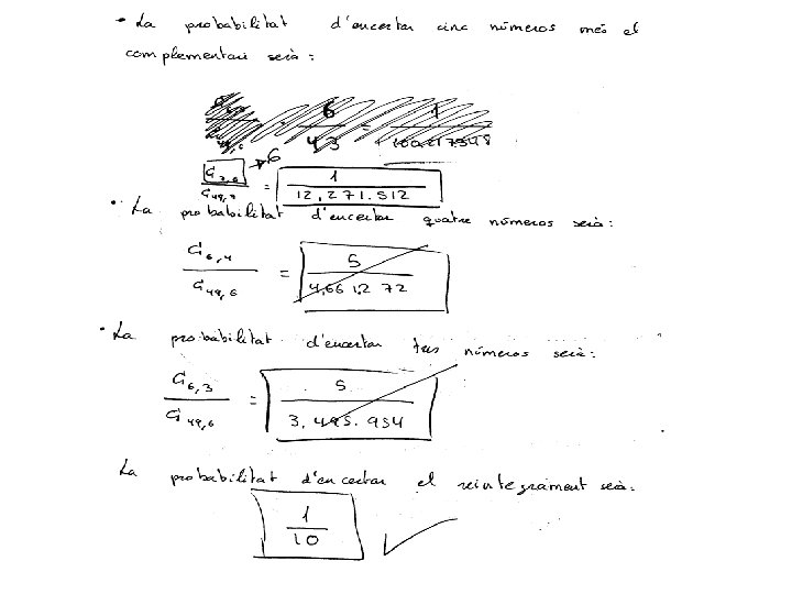 4. - En el sorteig de la Loteria Primitiva s’extrauen 6 boles de 49 números possibles, amés d’una altra bola amb els número complementari i una bola d’un altre bombo (del 0 al 9) per a determinar el reintegrament (devolució de la’aposta). Hi ha un primer premi “gros” per als encertants del sis números de la combinació guanyadora; i uns altres premis menors: cinc números mes el complementari, cinc números, quatre números, tres números i el reintegrament. El preu de l’aposta es un euro. Si apostem un euro, calculeu la probabilitat de que toque cadascun dels premis. Solució: Escollim sis caselles de les 49 possibles. Per tant la probabilitat d’encertar el sis números és: La probabilitat d’encertar-ne cinc i fallar-ne un, és, degut a que el fallat pot estar en qualsevol de les sis posicions: