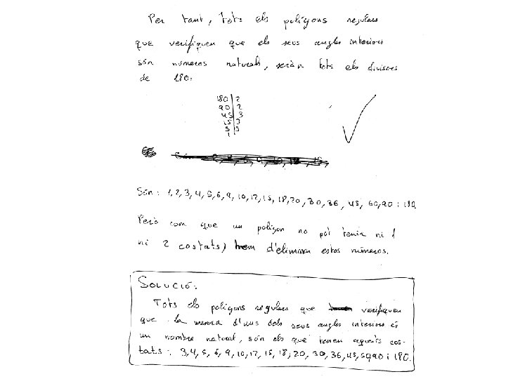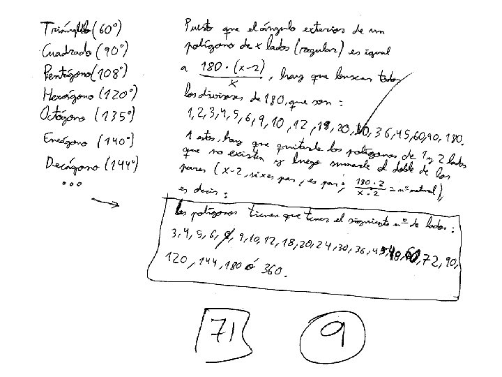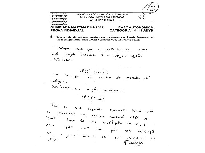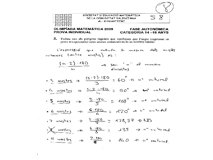 5. - Trobeu tots els poligons regulars que verifiquen que l’angle (expressat en graus sexagesimals) entre arestes consecutives és un nombre natural Solució: Siga n els nombre de costats, AB una aresta i O el centre de la circumferència circumscrita. Aleshores Com OA = OB el triangle es isosceles i per tant Com la suma dels angles d’un triangle es 180º i 2 és l’àngle entre arestes consecutives, tenim: Per tant n és un divisor de 180 major que 2 (per que és el nombre de costats d’un poligon). Com 180 = 32· 22· 5 els valors de n i 2 son: n 2 3 5 22 32 2· 32 22· 32 3 5 4 9 6 12 18 36 2· 3· 5 22· 32· 5 30 60 180 90 3· 5 32· 5 22· 5 15 45 10 20 60 108 90 140 120 150 160 170 168 174 178 176 156 172 144 162
